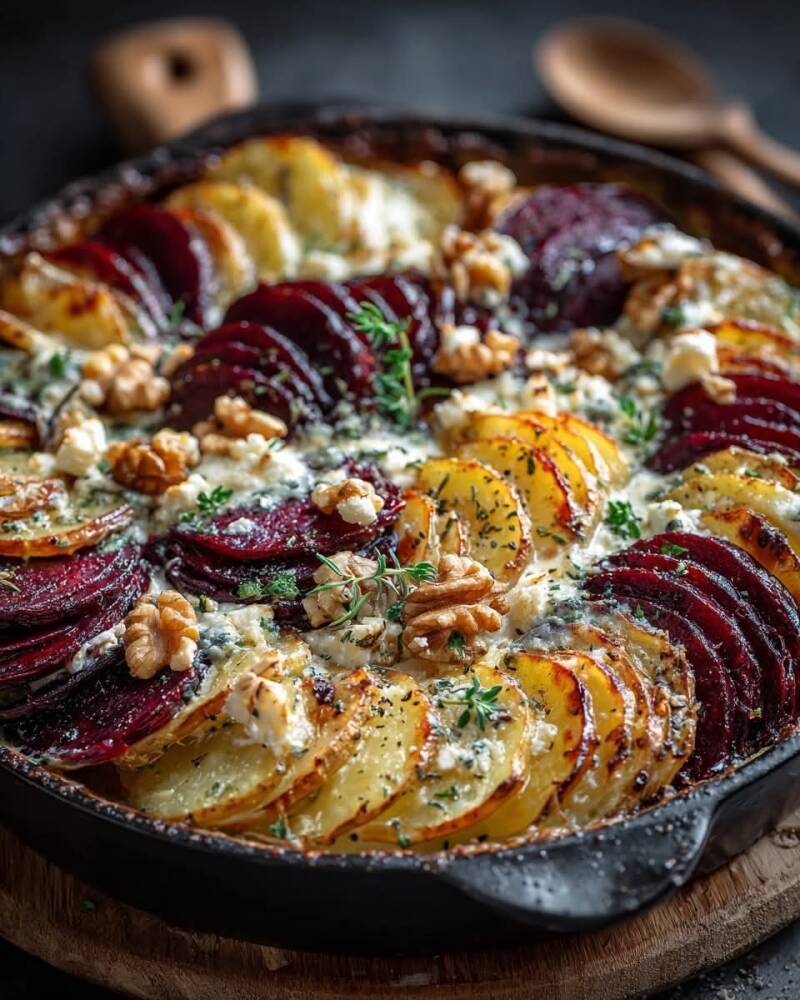 Layered Beet & Potato Gratin with Feta & Walnuts